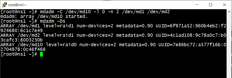 mdadm 명령어를 통해 raid 1으로 생성된 2개의 장치 md1 과 md2를 일반 디스크로 raid를 구성할때와 같이 raid 0로 설정하여 묶어내면 생성한 /dev/md10은 raid 1+0으로 구성되게 된다.