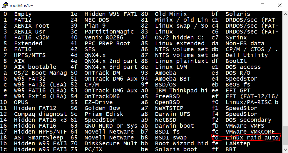 t 커맨드를 통해 파일시스템 유형을 변경할 수 있고 fd 라는 hex code를 통해 Linux raid auto 모드로 변경하자.