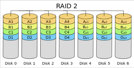 RAID 2는 데이터 저장용 디스크와 복구용 디스크를 나누어 저장한다. 이때 데이터 저장시 RAID 0와 같은 스트라이프 방식을 사용하며 데이터 복구에는 해밍 코드를 통해 데이터 복구를 수행한다.