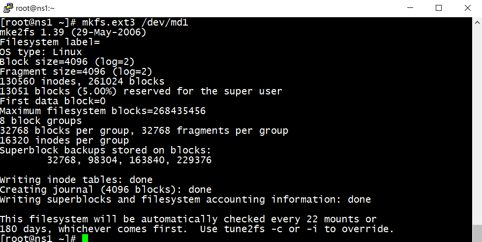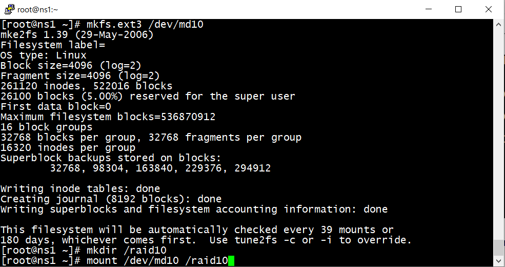 raid는 파티션을 나눈뒤 생성하므로 파티션 설정은 이미 생성되어 있는것과 같으므로 이제 해당 하드에 데이터를 저장할 수 있도록 mkfs 명령어를 사용해 파일시스템을 생성해주어야 한다.