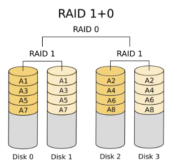0+1과는 거꾸로 RAID 1을 사용해 미러링으로 구성한다. 그리고 미러링으로 구성된 디스크들을 스트라이핑을 통해 묶는 방식을 수행한다.