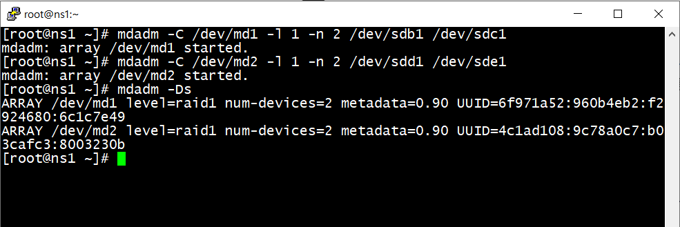mdadm -C /dev/md1 -l 1 -n 2 /dev/sdb1 /dev/sdc1 예시에서 사용한 명령어의 뜻을 해석하면 sdb1, sdc1 2개의 장치를 묶어 RAID level을 1로 구성하고 생성되는 raid 장치의 명은 /dev/md1으로 생성해라 라는 뜻을 가지는 명령어가 된다. 명령어를 다르게 작성하면 mdadm --create /dev/md1 --level=1 --raid-devices=2 /dev/sdb1 /dev/sdc1도 같은 동작을 수행한다.