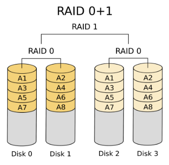 RAID 0+1은 0 와 1을 동시에 구현한 방식이다. 먼저 스트라이핑한 디스크를 생성후 스트라이핑 한 디스크들을 미러링방식으로 묶어서 구현한다.