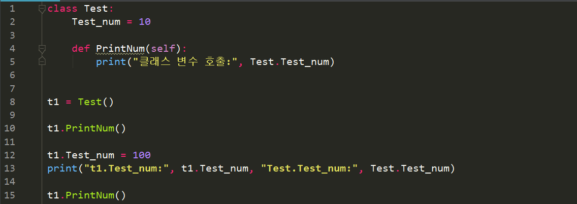 t1이 가진 클래스변수를 호출한다고 t1.Test_num을 하게 되면 이는 객체 변수 Test_num을 호출하게 되는 것이다. 변수명이 같다고 헷갈리면 안 된다. 위의 예시에서 t1.Test_num = 100을 사용하면 클래스 변수명과 같기 때문에 클래스 변수가 변할 것 같지만 클래스 변수는 값이 변하지 않고 두 개의 변수가 다른 값을 출력한다.
