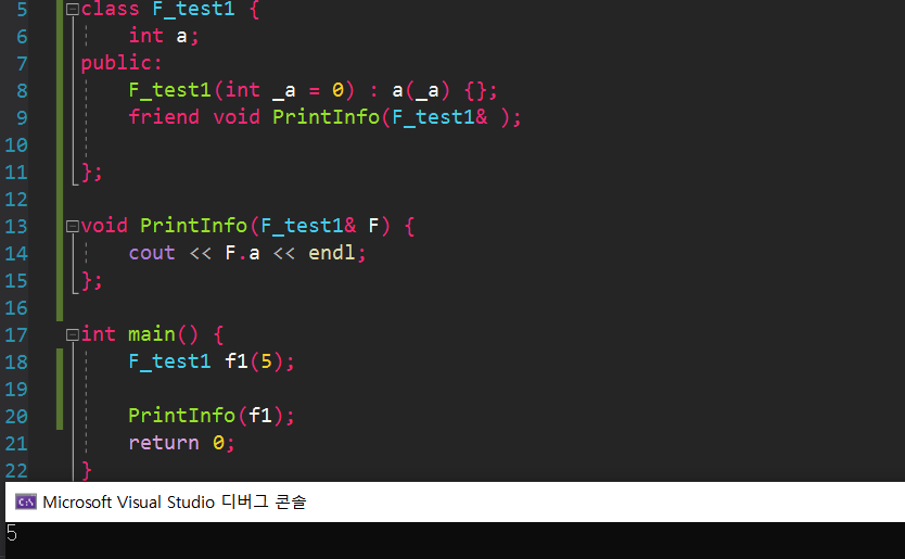간단하게 예시를 통해 friend 키워드의 기능을 확인하면 private 멤버만 있는 F_test1에 friend키워드를 F_test2클래스에 적용해 F_test1에 선언해 준다. 그렇다면 F_test1은 F_test2를 friend로 인식해 private로 설정되어 외부에서 접근 불가능한 데이터도 접근가능하도록 허락해 주는것이다. 따라서 F_test2 클래스를 이용해 만든 객체 f2에서 f1의 private 멤버 변수 a의 값을 설정하고 출력 가능하게 되는 것이다.