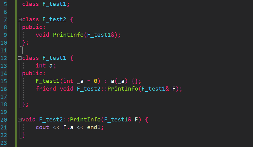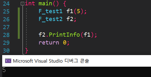 또한 F_test1함수를 전방선언하고 PrintInfo 함수를 F_test2 내부에 정의할경우 F_test1클래스가 존재한다고 전방 선언만 해놨기 때문에 해당 클래스의 멤버는 무엇이 존재하는지 모르기 때문에 F.a로 멤버 변수의 접근이 불가능 하다는 에러를 발생시킨다. 따라서 a 변수를 컴파일러 알 수 있도록 F_test1의 정의가 끝난뒤에 클래스 밖에서 PrintInfo함수를 정의해야한다.