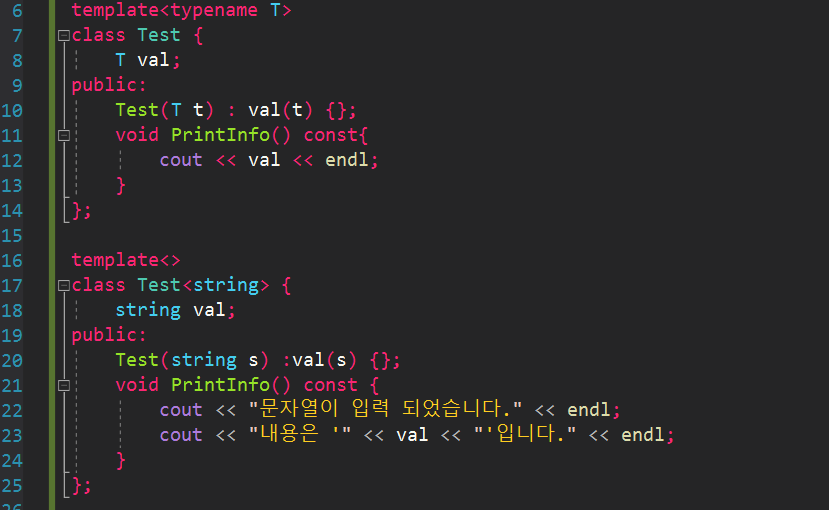 따라서 템플릿 인수로 string타입이 전달될 경우 기존의 템플릿 클래스에 정의되어있는 멤버 함수와는 다른 동작을 수행하게 된다.