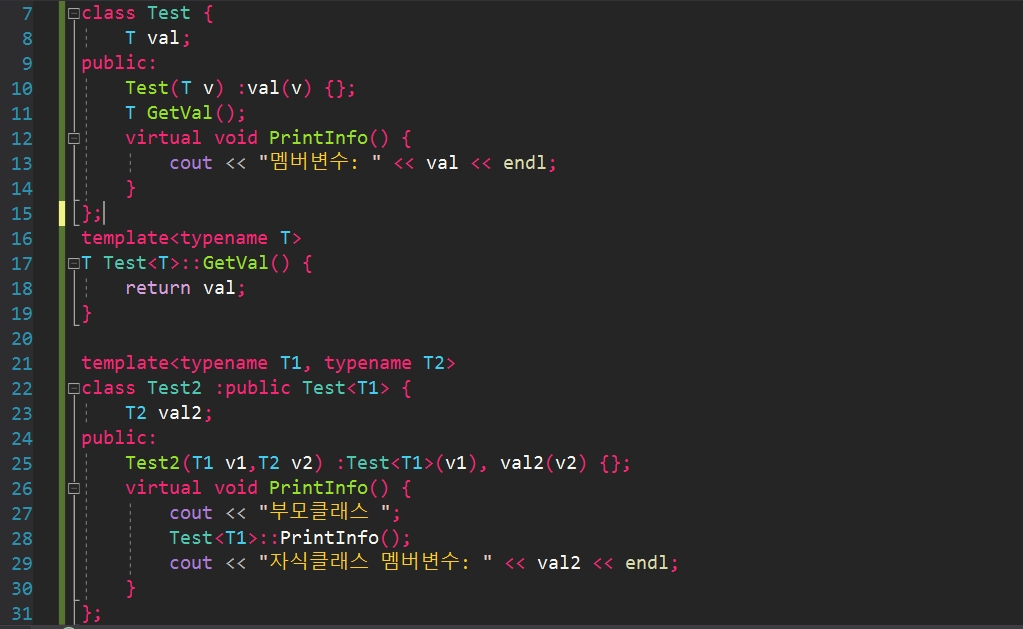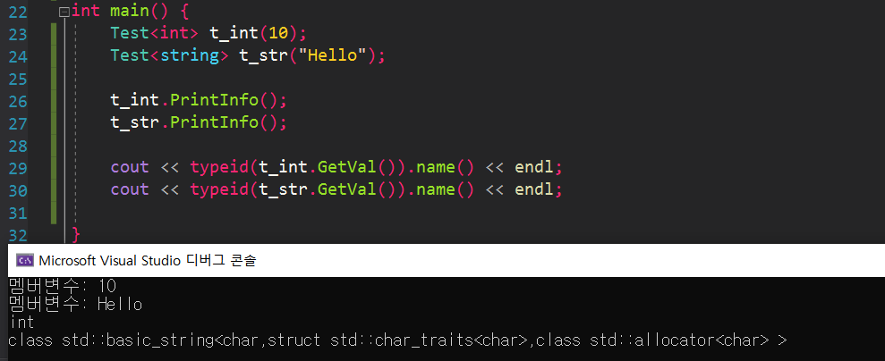 멤버 변수 val과 멤버 함수 GetVal, PrintInfo를 가지는 간단한 클래스 템플릿을 생성했다. 주의할 점은 멤버 함수를 클래스 외부에서 정의할 경우 임의의 타입 T를 정의해 주어야 하기 때문에 template<typenae T>를 적어 주어야 하며 범위 연산자를 통해 어떤 클래스의 멤버 함수인지 표현해 줄 때도 T Test<T>::GetVal() 로 클래스에 명시해줘야 한다. typename T는 임의의 데이터 타입 T를 사용한다 라는 뜻이므로 T 대신 다른 이름을 사용해도 된다.