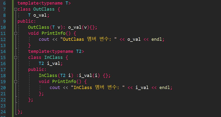 ② 클래스를 중첩하여 정의하는 중첩 클래스 템플릿이 존재한다. 클래스 내부에서 정의된 템플릿 클래스를 중첩 클래스 템플릿이라고 한다.