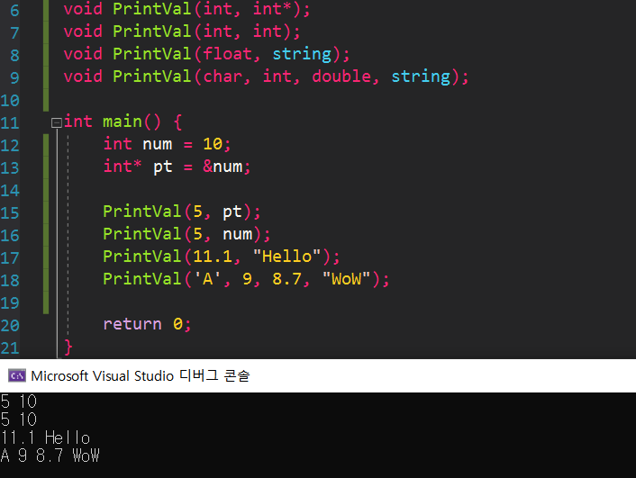 오버로딩은 함수 매개변수의 개수나 형태를 다르게 하여 재정의 하는 방법이라고 하였다. 다양한 오버로딩의 경우에 대해 확인해 보자.