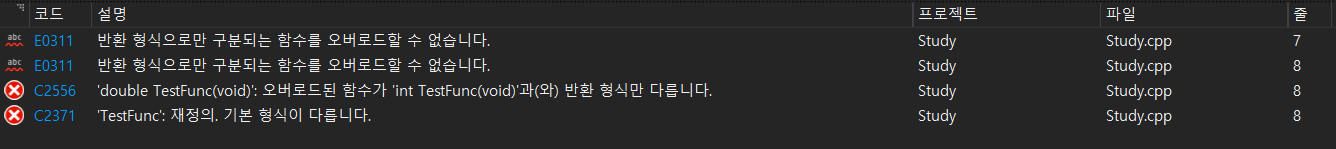 위의 경우 반환 타입이 달라도 매개변수의 개수가 0으로 동일하므로 오버로딩이 되지 않고 에러가 발생하게 된다. 따라서 이 경우는 함수의 이름은 다르게 설정해야 한다.