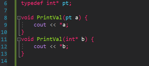 typedef를 통해 데이터타입 이름을 바꾸어 사용하여도 오버로딩은 가능하지 않다. typedef는 별칭을 만드는 것이지 타입자체가 변경되는 것은 아니기 때문이다.