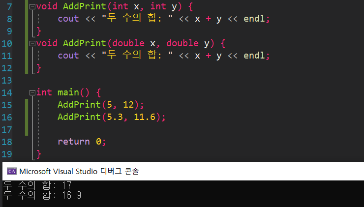 그런 경우 오버로딩을 통해 함수를 재정의 하여 다양한 자료형에 대해 동일한 기능을 수행하는 함수를 생성하여 다양한 타입의 경우에도 대비하여 프로그램의 코드가 불필요하게 복잡해지는 것을 막을 수 있다.