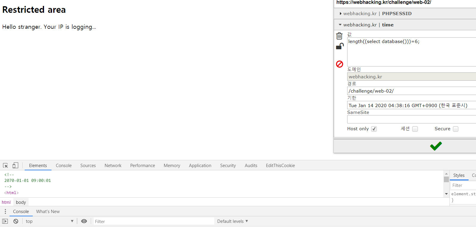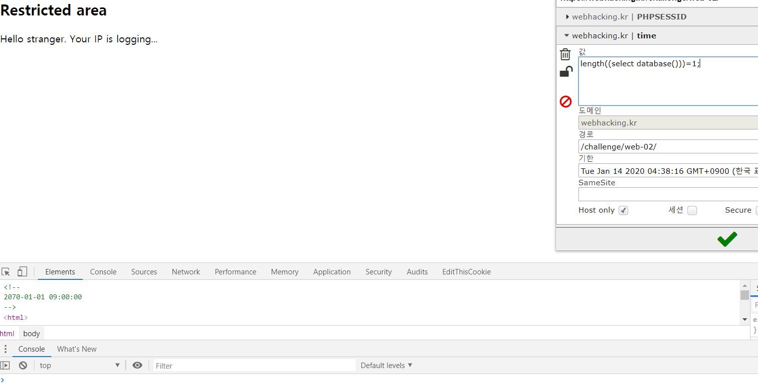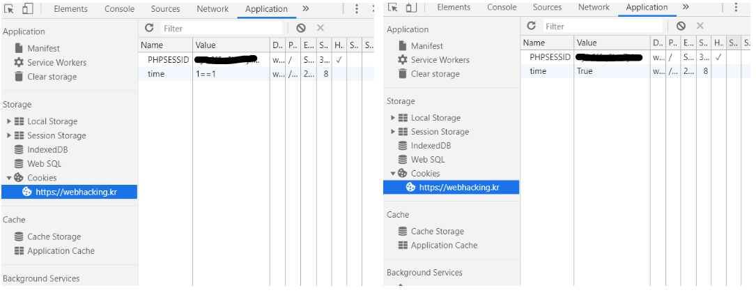 따라서 admin.php의 패스워드를 알아내기 위해 time 쿠키값을 변조하여 sql injection을 시도해야 할 것 같다.