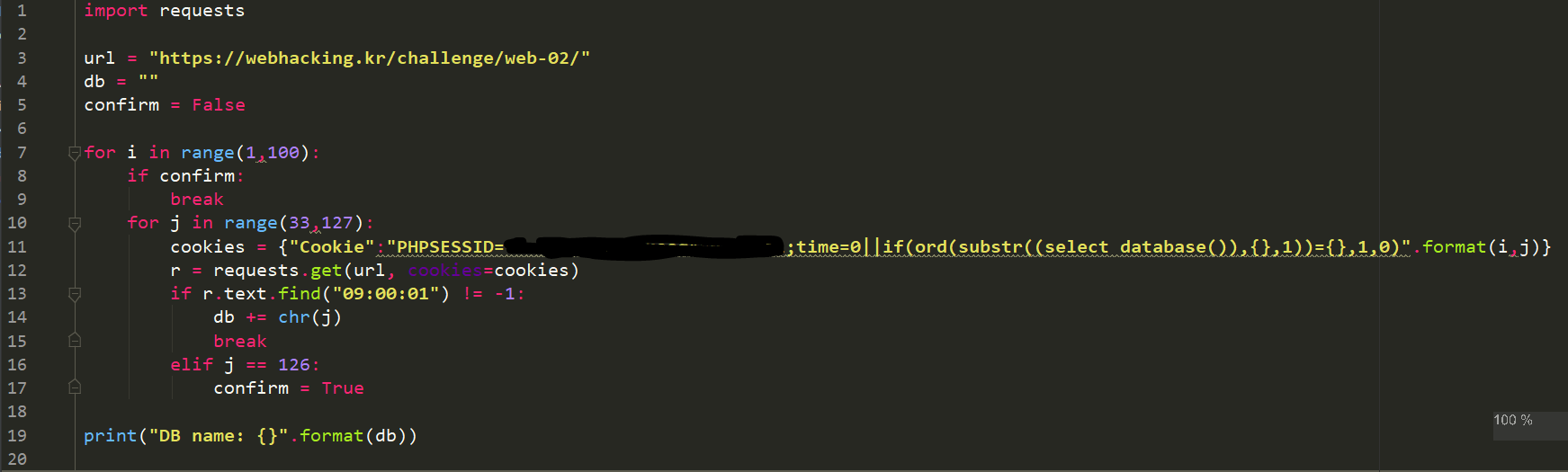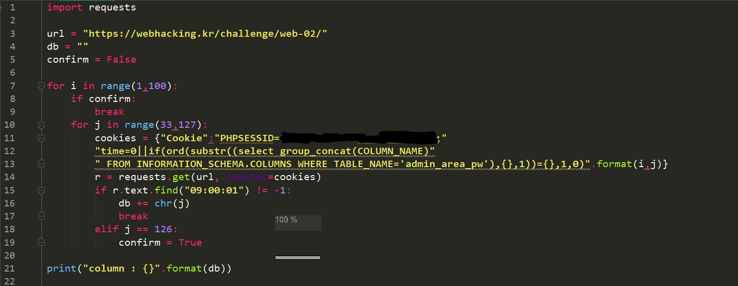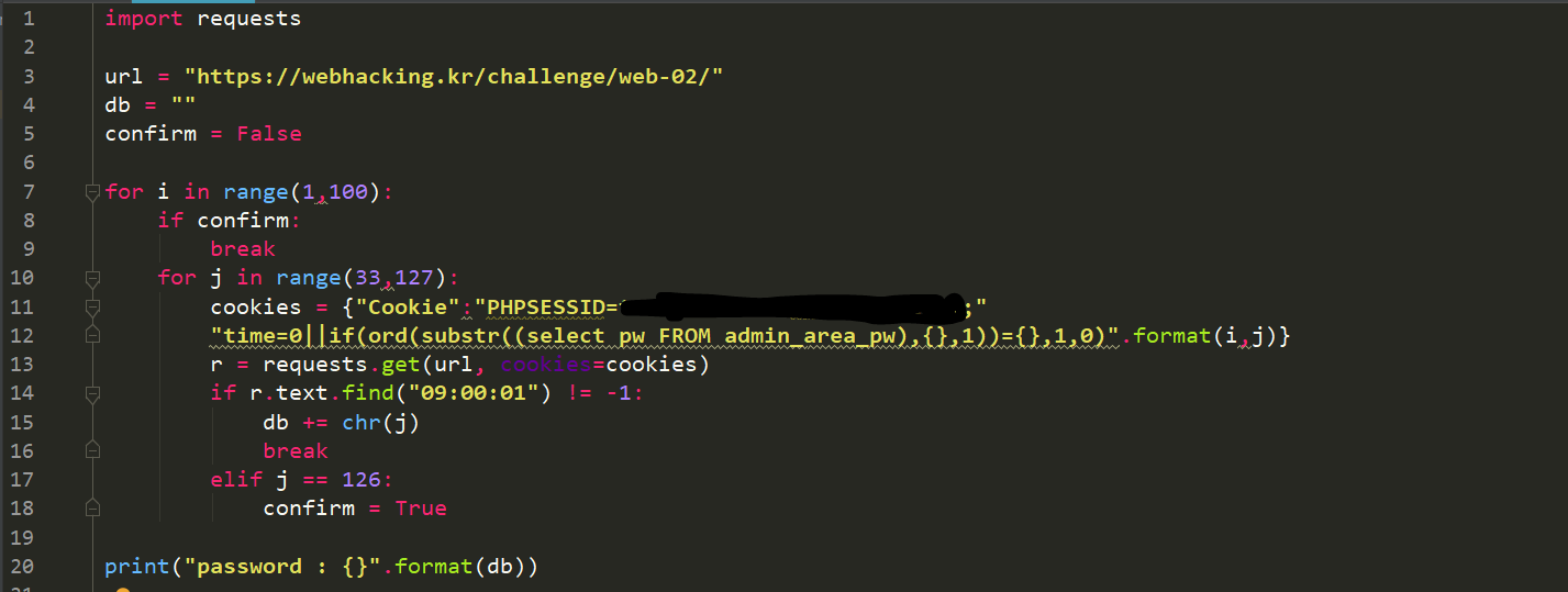 첫 번째 글자가 'a'부터 'Z'중 어떤 글자인지 글자가 아니면 숫자 또는 기호가 들어가는지 판단하기 위해 파이썬 에서 아스키코드를 이용하여 글자 수 6개 모두 시도해 보면 된다. 반복적인 작업을 위해 파이썬을 이용해 변조된 쿠키값으로 해당 글자가 맞는지 참 거짓을 판단하기 위해 sql문을 전달하고 그에 따른 참 거짓을 알 수 있는 첫 번째 주석 부분의 문자열이 09:00:01인지 09:00:00인지를 판단해 알맞은 글자를 찾는 동일한 과정을 반복하면 될 것이다.