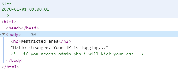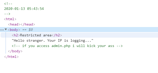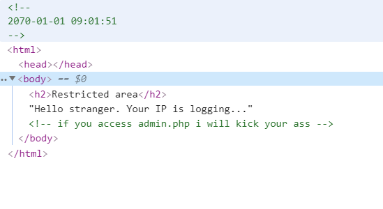 두 번째 주석에 admin.php에 접근하면 엉덩이를 걷어차 버린다는 주석을 확인할 수 있다.