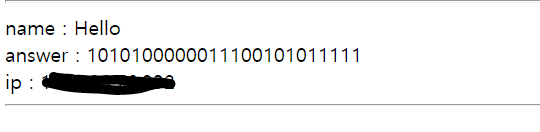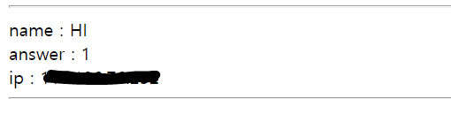 이름을 입력하라고 해서 이름을 입력하게 되면 name에 내가 입력한 값이 출력되고 answer은 2진수처럼 생긴 숫자가 자동으로 들어가 있으며 ip로 임의의 ip주소가 출력되는것 같다.