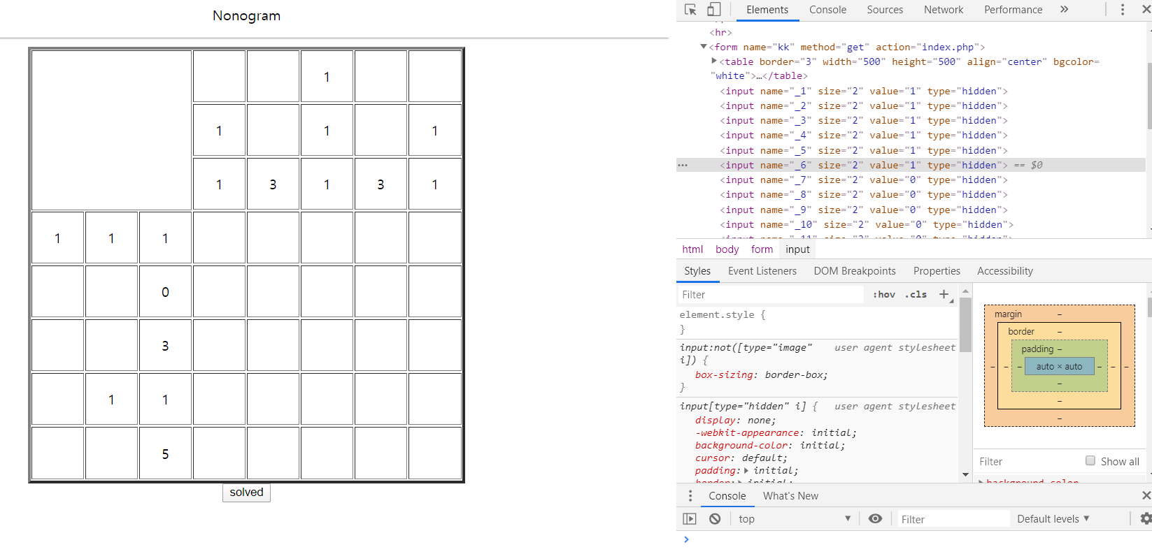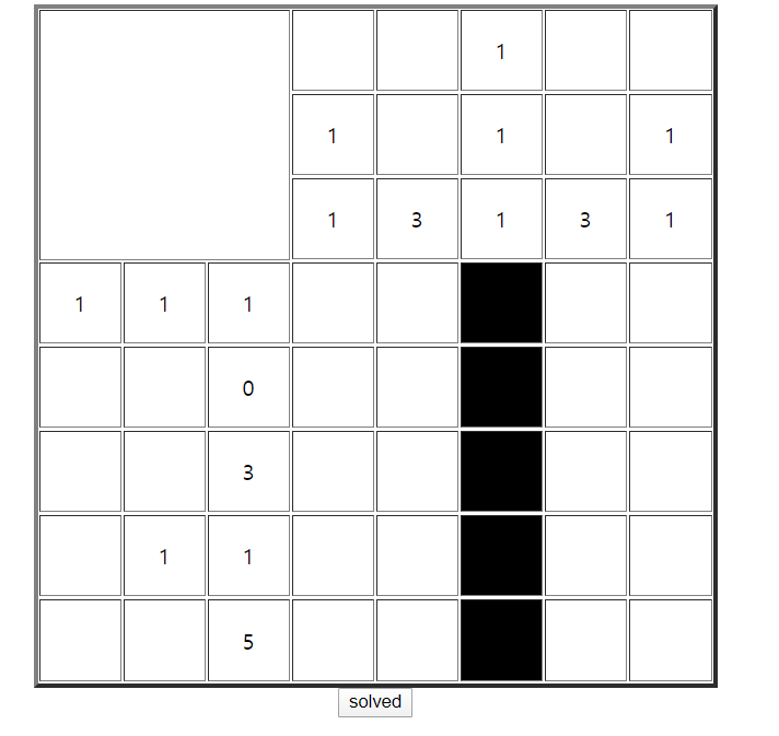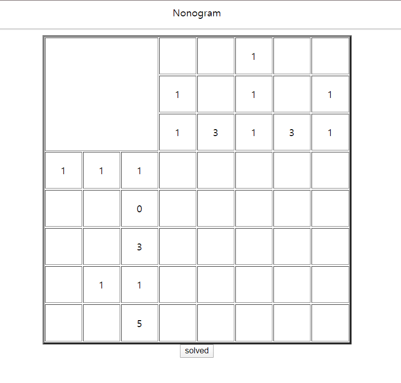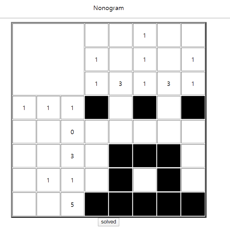 해당 페이지의 소스를 보게 되면 url에 보이는 _1, _2와 같은 값들이 보이고 해당 값을 1로 바꾸어서 보내보면 똑같이 No! 를 출력하는 것을 확인할 수 있다. 여기서 한참 고민했지만 그냥 해당 네모네모로직을 풀어서 solved로 제출하면 되는 것이었다. (내가 눌러서 검은색으로 변한 칸에 해당하는 변수의 값이 1로 변경되는 것이었다.)