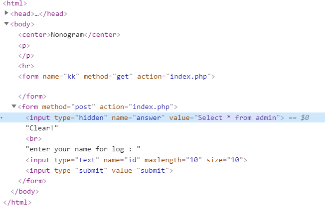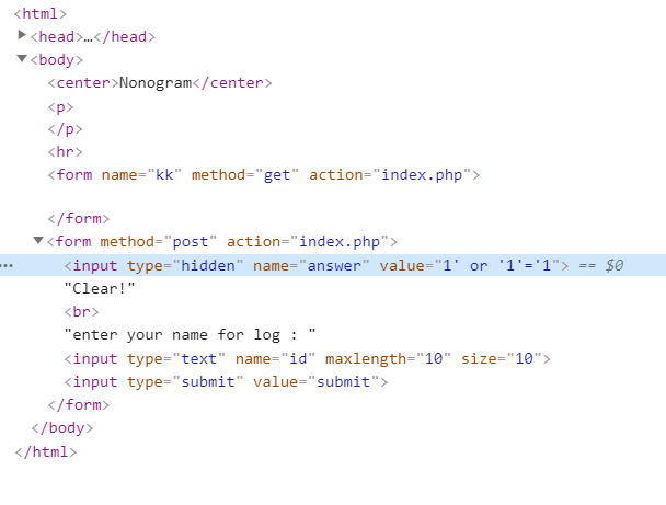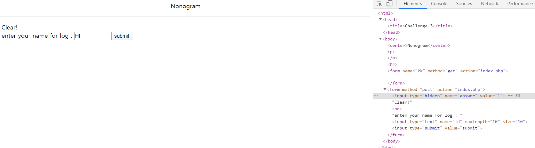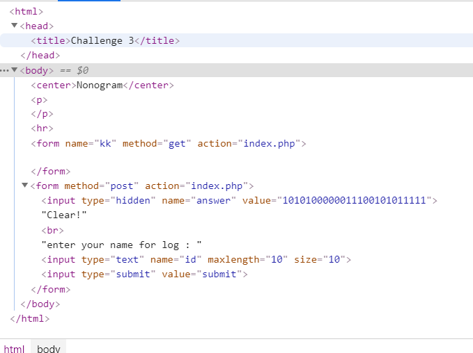 해당 페이지의 정보를 확인해보기 위해 소스코드를 확인해 보면 input의 type이 hidden으로 설정된 answer가 위에서 확인한 2진수 처럼 생긴 자동으로 들어가 있던 값을 가지고 있는 것을 확인할 수 있다. 그리고 우리가 입력하는 값은 text type으로 id라는 곳에 전달된다.