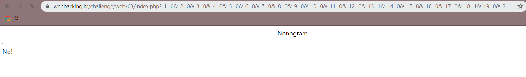 아무거나 선택하고 눌러보면 굉장히 복잡한 url과 함께 No!라는 문구가 출력되고 다시 Nonogram으로 돌아가게 된다.