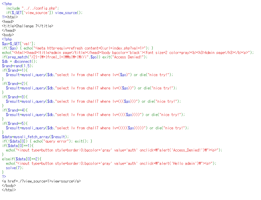 ② $result는 난수에 따라 입력되는 쿼리문이 달라지는데 그중 "select lv from chall7 where lv = ($go)" 로 하나를 임의로 선택 괄호가 한개일때의 쿼리문에서 $go에 저장되는 값을 조절하여 result에 2가 저장되도록 한다.