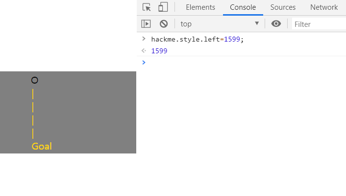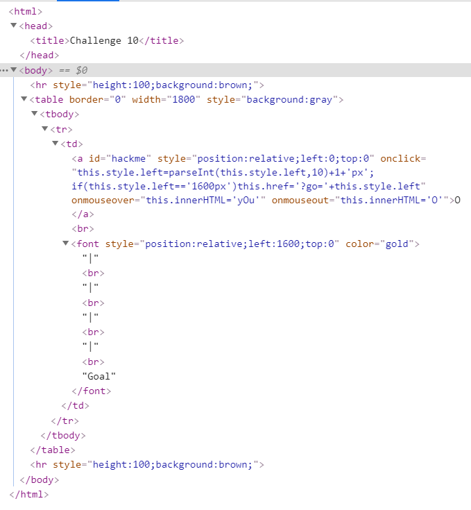 hackme라는 id가 존재하고 클릭할 때 onclick 메서드를 통해 클릭시 1픽셀씩 이동하는 것을 확인할 수 있다. 또한 조건문에서 this.style.left의 값이 1600이 되면 Goal이 위치한곳과 같아지며 url에 '?go='+this.style.left이 추가되며 문제가 해결되는 것 같다. 직접 1600번의 클릭을 해도 가능하겠지만 너무 불필요한 행동이므로 다른 시도를 해보자.